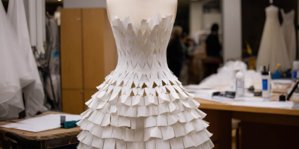 わたしがうれしいなと思うことは、自分がデザインした洋服を染めた布や紙、リボン・毛糸などを使って、本当の洋服のように紙の上で立体的に作れるようになったことです。